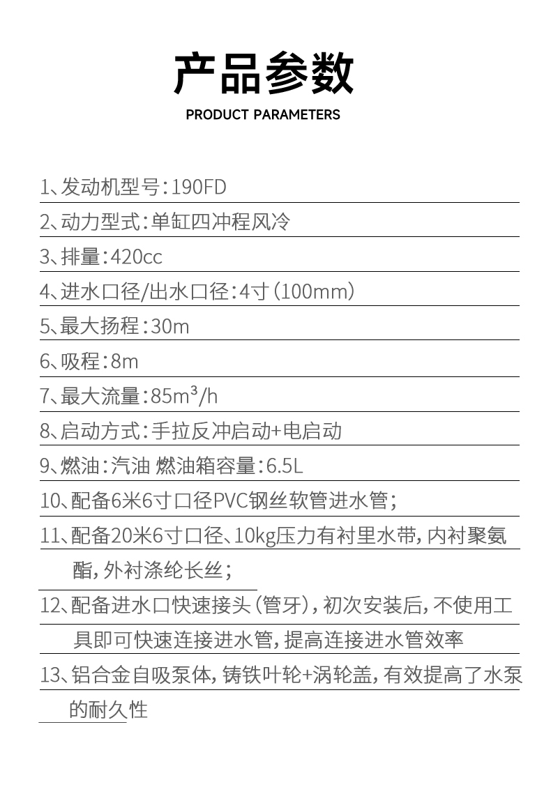 2. 動力充足,運行穩(wěn)定:搭載 190FD 型號發動機,配合 3600r/min 的額定轉速,為水泵提供持續穩定動力,保障高流(liú)量排(pái)水持續作業。